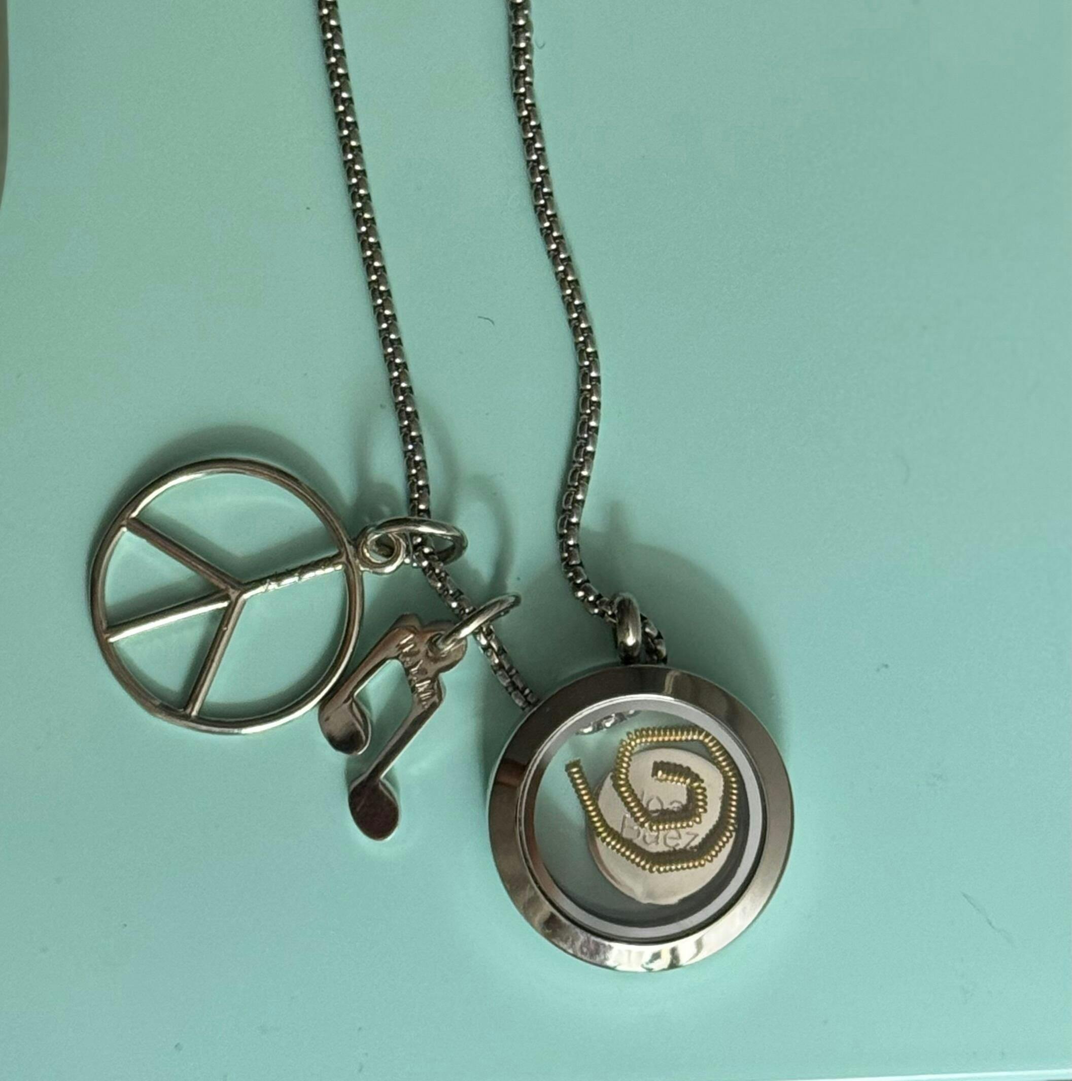 • One inch sealed stainless steel and glass locket also contains a disc engraved with the name of this musician.